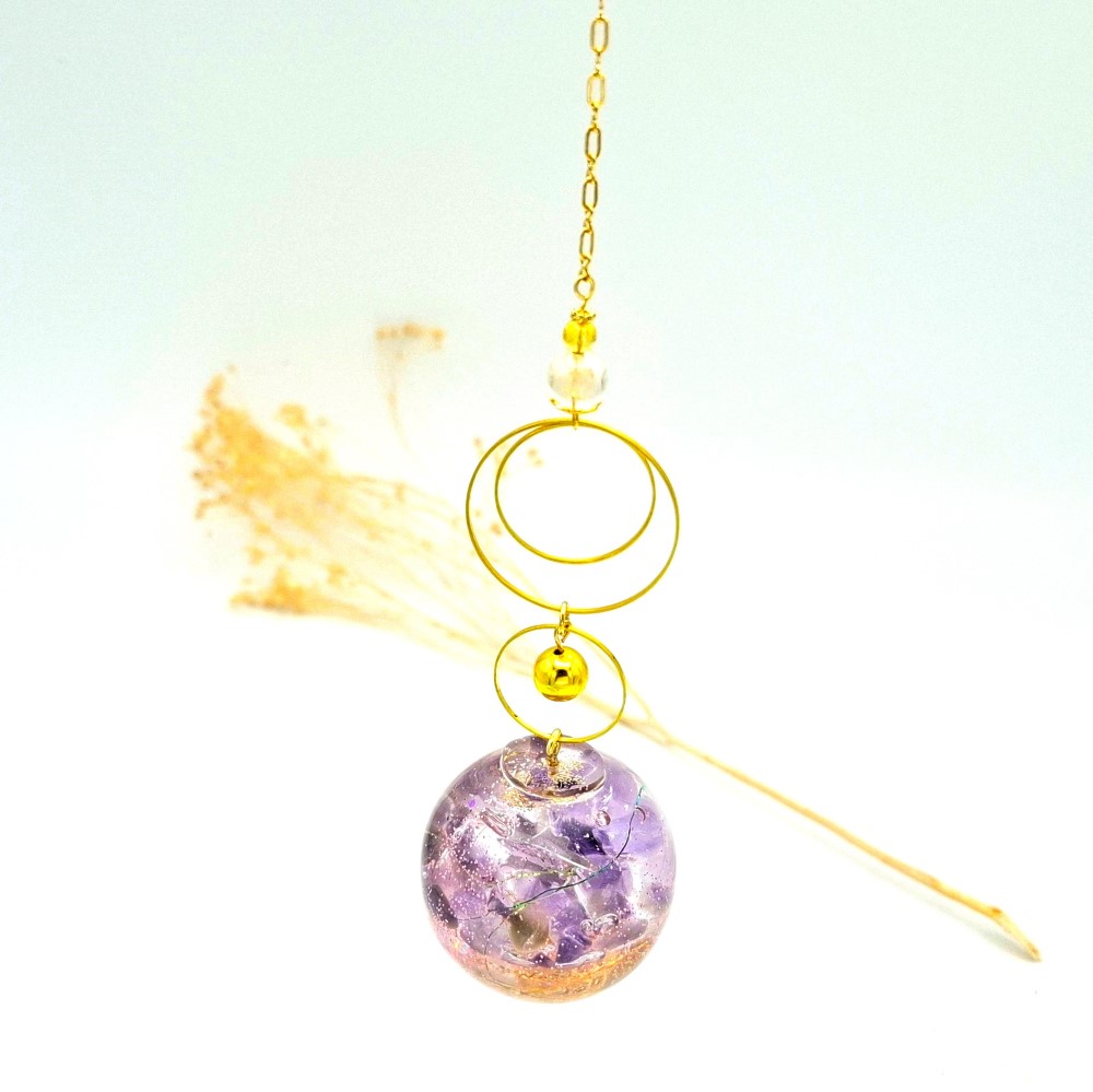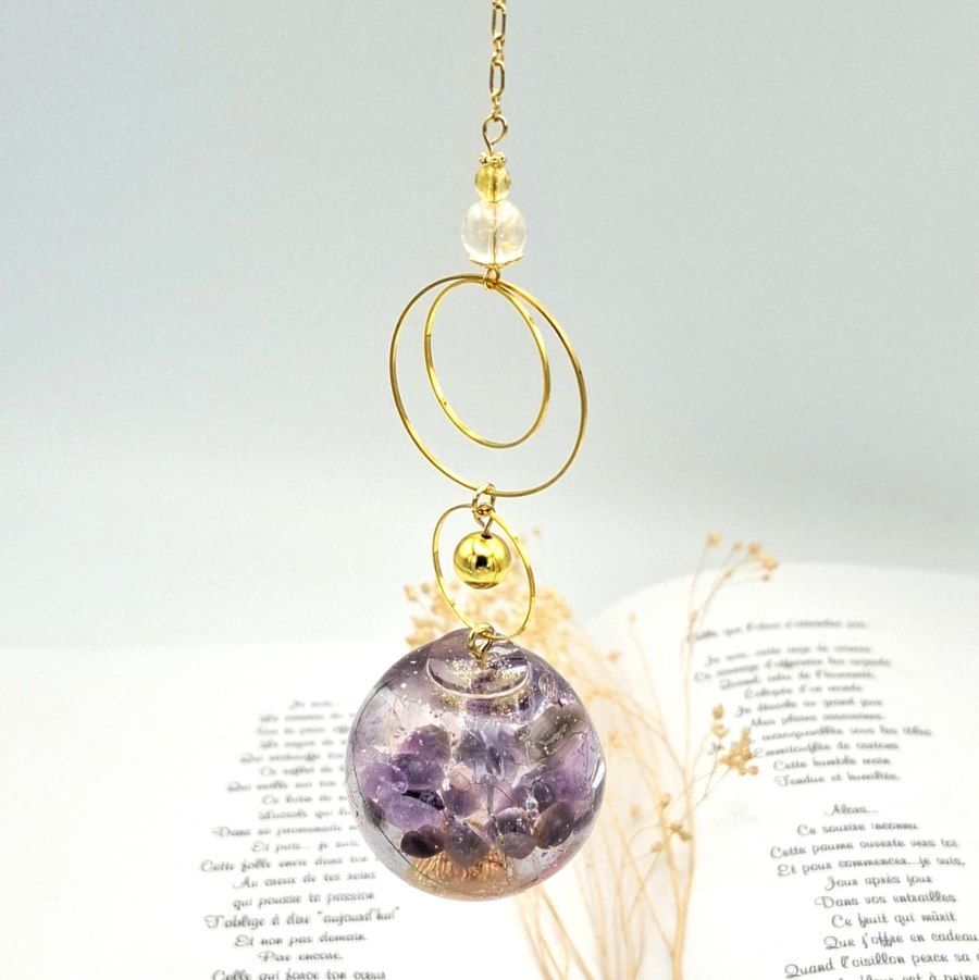Des cristaux d’améthyste sont insérés dans une sphère de résine UV. Celle-ci mesure 4cm de diamètre et ses anneaux dorés font 2cm et 3cm de diamètre.