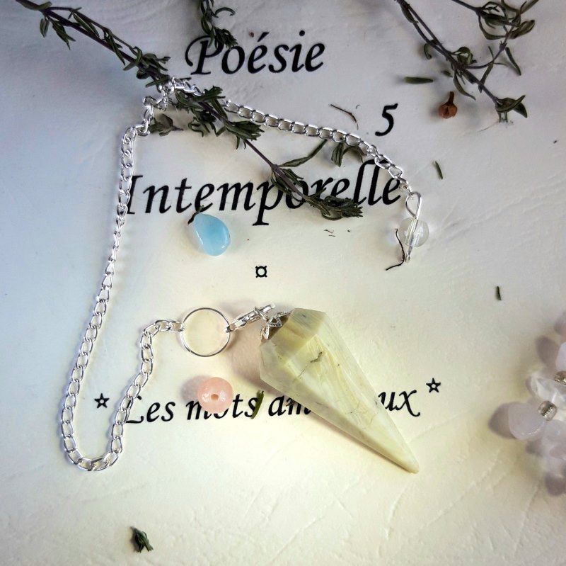 Le Pendule serpentine en pierre gemme naturelle est très joli avec sa couleur vert pastel tirant vers le jaune.