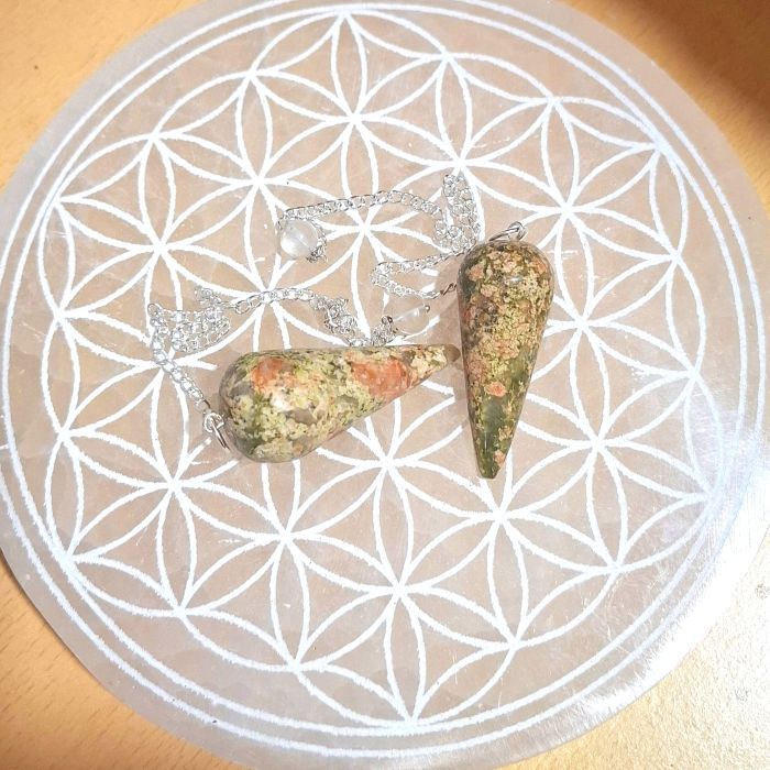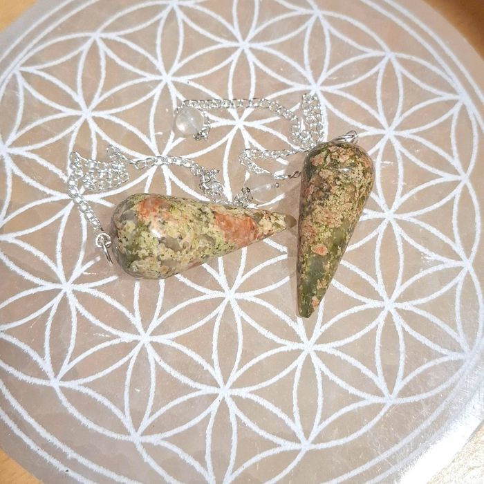 On choisit le pendule unakite, pour la douceur des vertus de cette gemme.