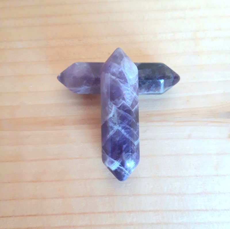 L’améthyste bi-terminée est une gemme façonnée en cylindre terminé par deux pointes.